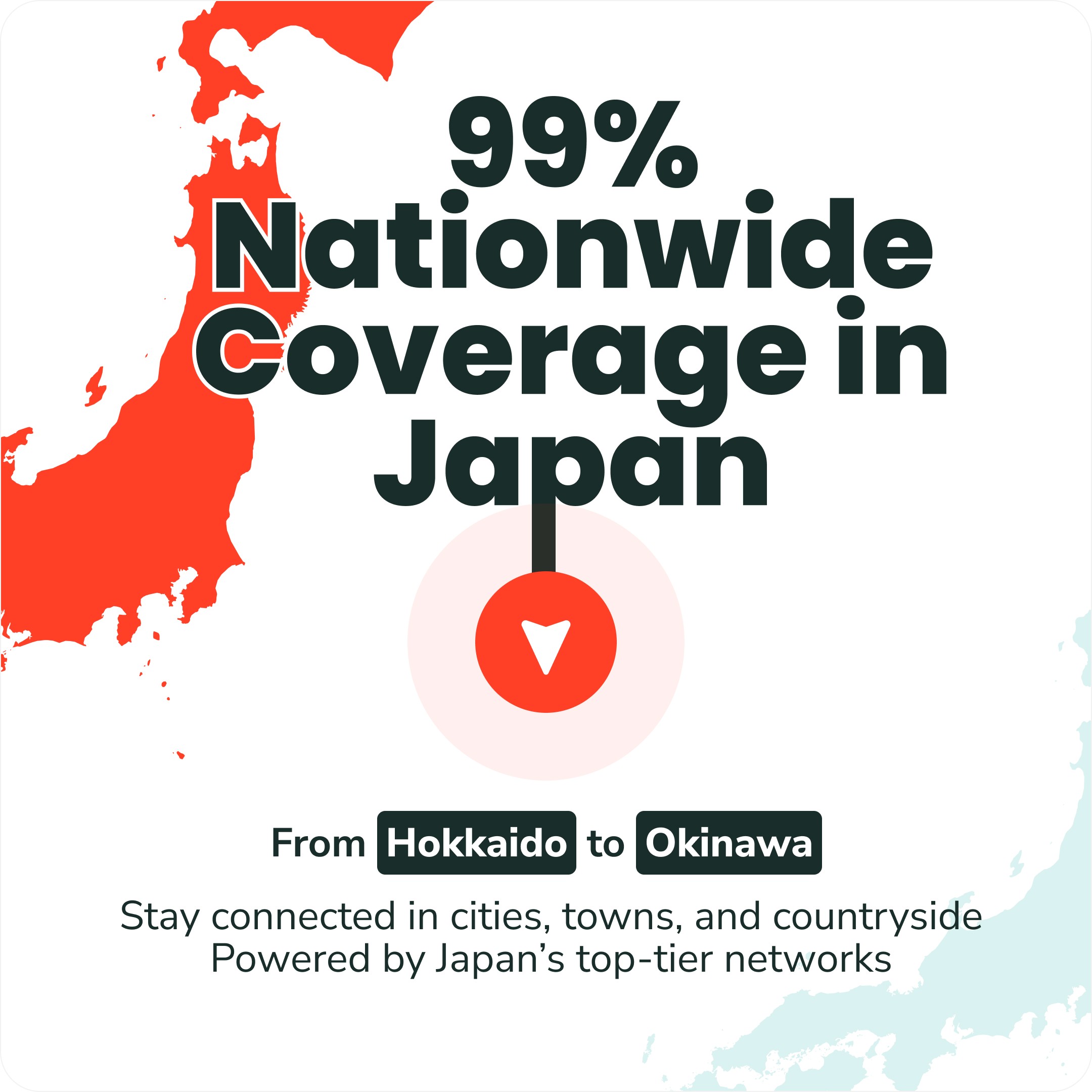 Travel anywhere in Japan, with 99% data coverage ensuring no drop-offs.